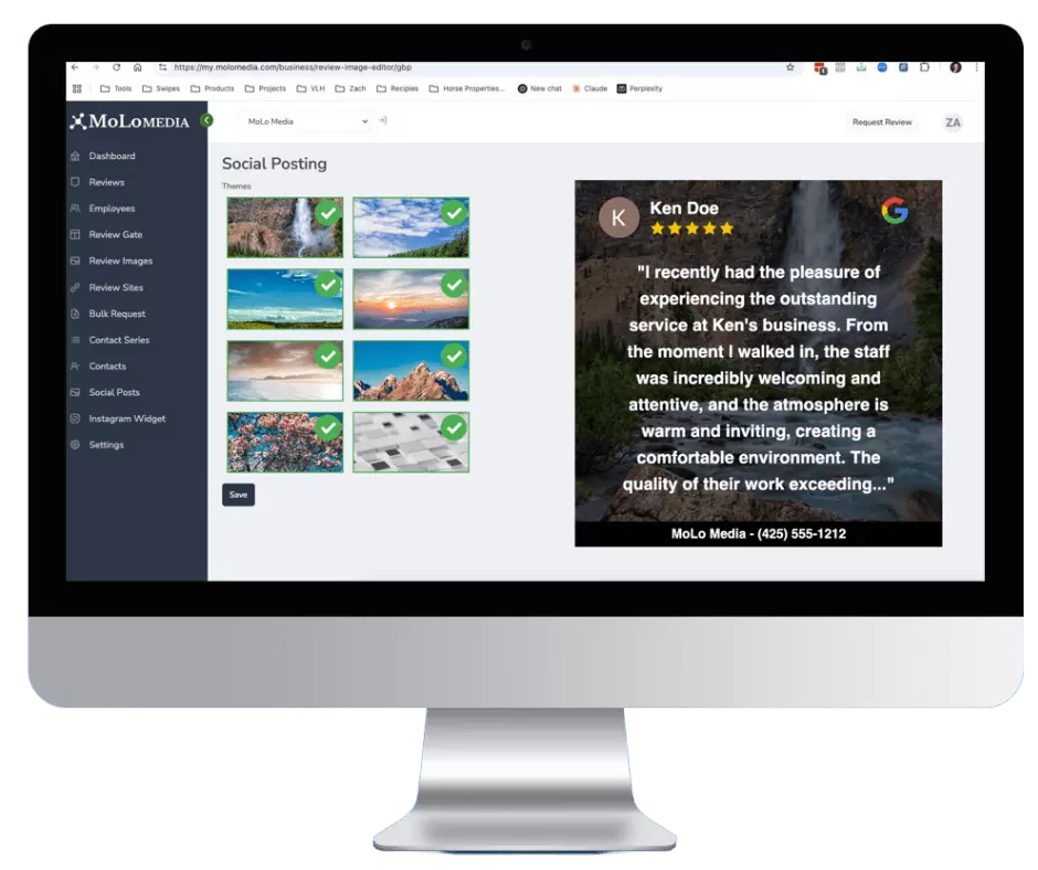 When new reviews come into the system we can automatically create an image of the review and post it on your Google Business Profile along with Facebook and Instagram. You can rotate between 8 different images and layout.
